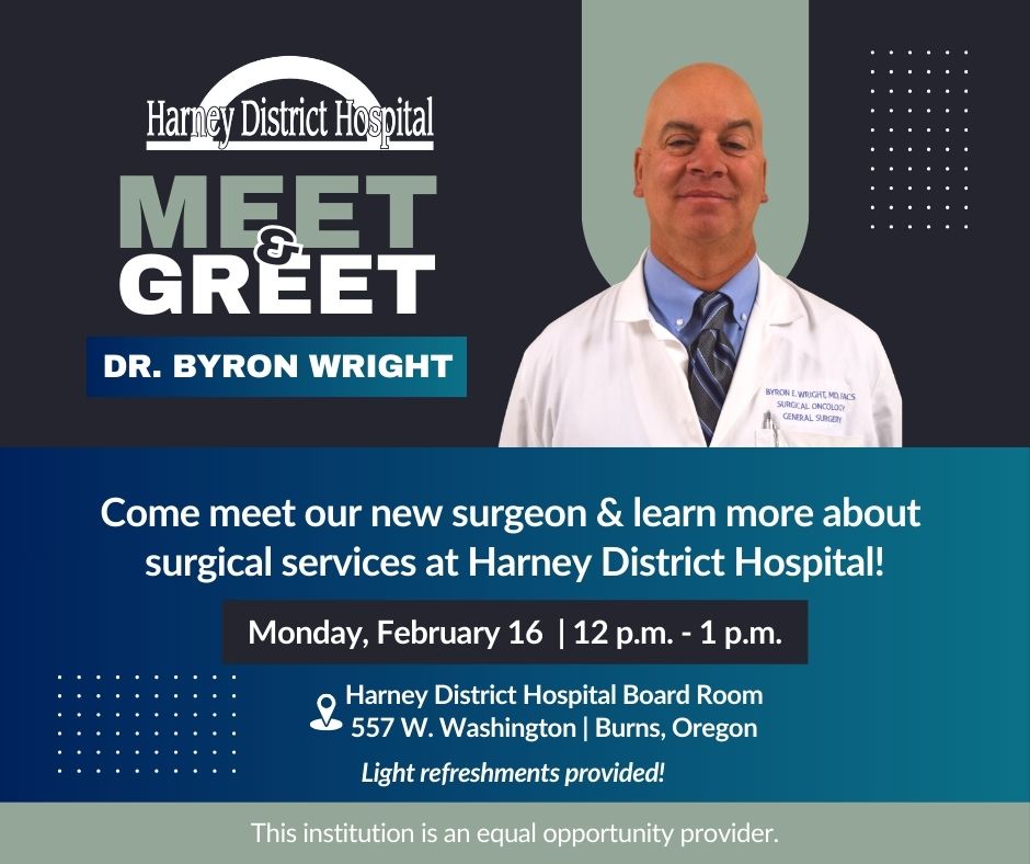 You're cordially invited to a community Meet & Greet with Dr. Byron Wright Monday, February 16, from noon to 1 p.m. in the Harney District Hospital Board Room. The hospital is located at 557 W....